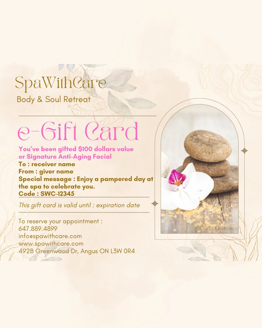Give the gift of beauty or wellness at your convenience to friends and family. Our E-Gift Card can be for a dollar value or any spa services and packages. Purchase them online with a customized e-Gift Card with your email address by contacting our spa at 647-889-4899 or to : info@spawithcare.com