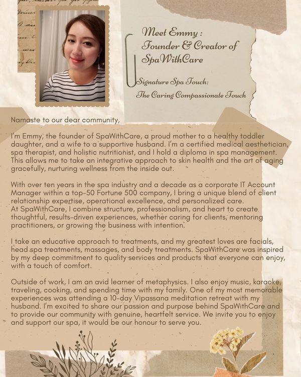 I’m Emmy, the founder of SpaWithCare, a proud mother to a healthy toddler daughter, and a wife to a supportive husband. I’m a certified medical aesthetician, spa therapist, and holistic nutritionist, and I hold a diploma in spa management. This allows me to take an integrative approach to skin health and the art of aging gracefully, nurturing wellness from the inside out.