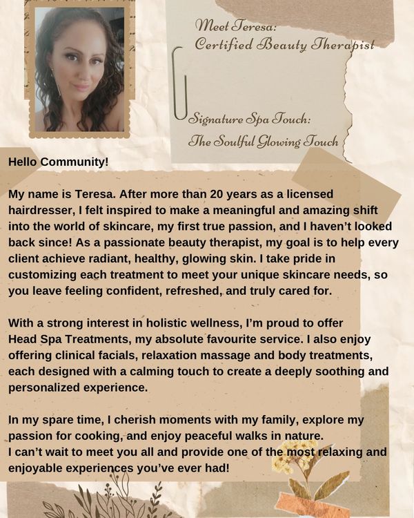 My name is Teresa. After more than 20 years as a licensed hairdresser, I felt inspired to make a meaningful and amazing shift into the world of skincare, my first true passion, and I haven’t looked back since! As a passionate beauty therapist, my goal is to help every client achieve radiant, healthy, glowing skin. I take pride in customizing each treatment to meet your unique skincare needs, so you leave feeling confident, refreshed, and truly cared for.