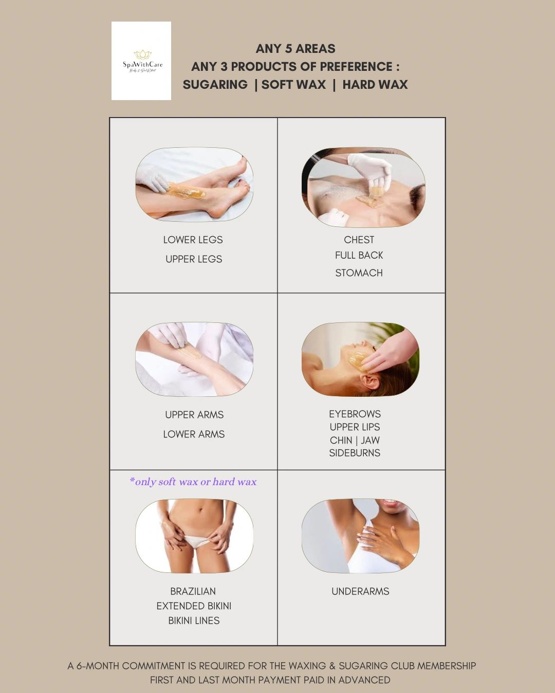 Our unique program allows our spa guest the flexibility and option at a discounted value for their waxing and sugaring needs. Enjoy a 20% discount when choosing 5 or more areas monthly (with a minimum of 6-month commitment for the program). We accept first and last month deposit.